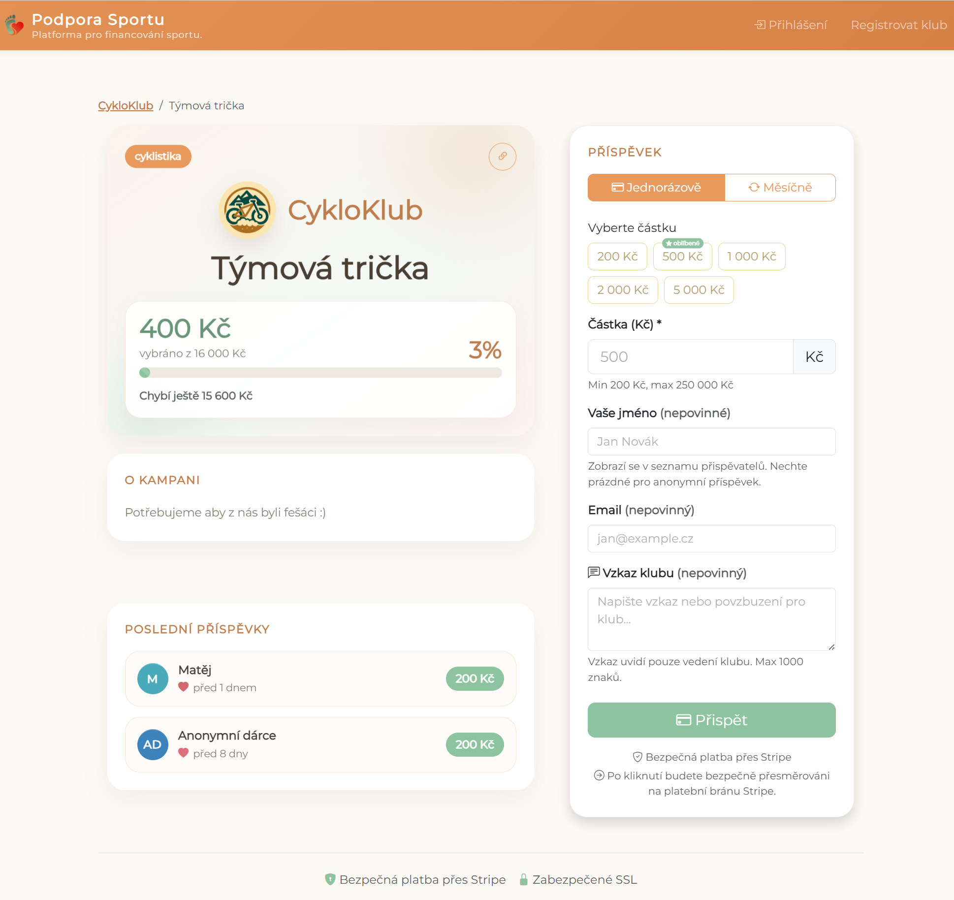 Platba proběhne přes Stripe a klub vidí výsledky i další historii ihned ve své administraci.